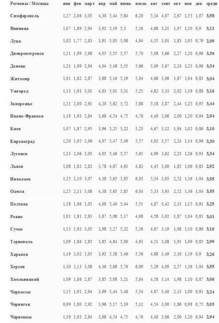 Средний месячный уровень солнечной радиации (солнечная постоянная) в городах Украины (кВт·ч/м2/день). Среднее значение за последние 22 года (по данным NASA)