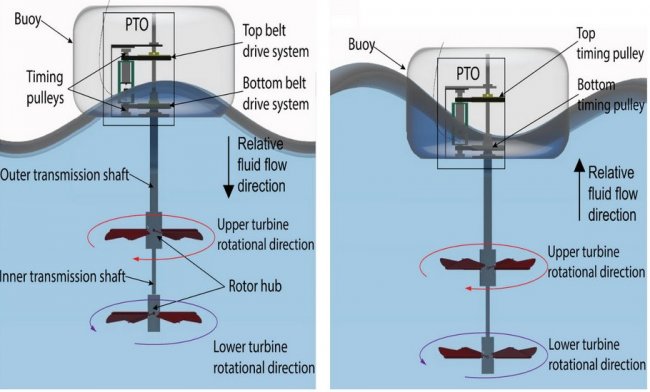 Оригинальный элемент разработки — два турбинных колеса, установленные соосно на валах, выходящих из основания поплавка. При возникающем из-за волн вертикальном движении буя турбины крутятся в противоположные стороны, вращая через валы и ременную передачу генератор, установленный внутри буя.