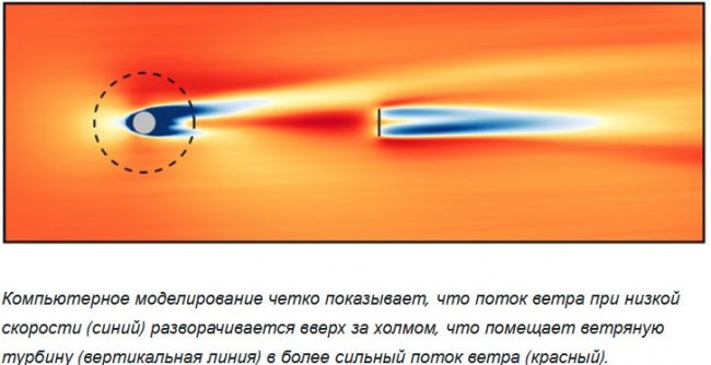 «Скорость ветра сразу за холмом ниже, из-за чего там создается зона низкого давления. В нее засасывается воздух сверху, где ветер намного сильнее, чем у земли, — объясняет автор исследования доктор Ричард Стивенс. — Это означает, что ветряная турбина не должна быть выше холма, чтобы получать преимущества от обдувания сильными ветровыми течениями, находящимися на больших высотах».