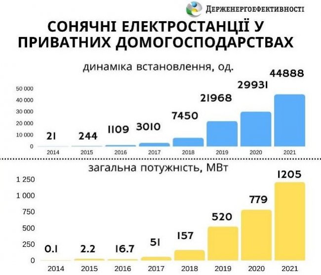 В целом к концу 2021 года в Украине насчитывается около 45 тысяч домохозяйств, которые используют солнечные панели и экономят на счетах за электроэнергию. Общая мощность таких СЭС превысила 1,2 ГВт.