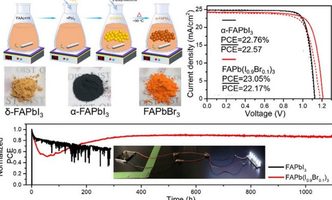 Из порошкообразного перовскита α-FAPbI3 создали небольшие фотоэлементы, обладающие КПД 23,5% и сроком службы свыше 2 тыс. часов. На основании этой ячейки ученые собрали солнечную панель размером 5×5 см, демонстрирующую эффективность 14%.