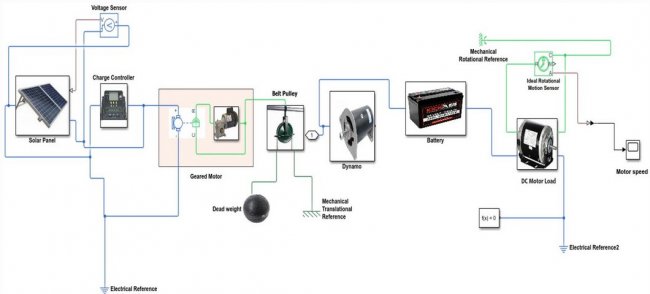 Проведя ряд экспериментов над моделью системы, обеспечивающей момент инерции на промежуточном шкиве 16×10−6 кг•м2, исследователи пришли к выводу, что для эффективного функционирования такой установки мощность фотопанелей должна превышать 500 Вт при суточной продолжительности активного солнечного свечения 1 час. Если же этот параметр составляет от 6 до 9 часов, то необходимая отдача от модулей снижается до 60–80 Вт.