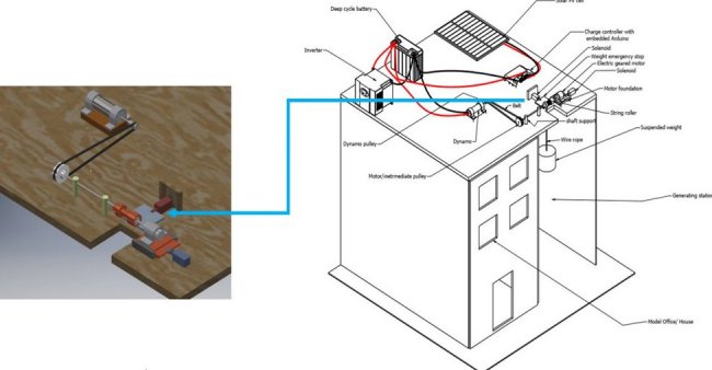 Солнечные панели подключены к контроллеру, который управляет подачей энергии на аккумулятор и мотор-редуктор. Электропривод установлен на крыше и подсоединен к катушке с тросом, на котором подвешен груз. С другой стороны к барабану с тросом подходит полый вал с промежуточным шкивом, предназначенным для передачи вращения электрогенератору.