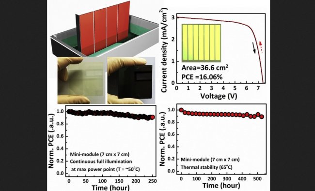 Путем простого погружения подложки в такой раствор исследователем удалось создать высококачественную тонкую однородную пленку кристаллического перовскита. С помощью этой методики были получены два миниатюрных фотомодуля: площадью 16 см2 и чуть менее 37 см2.