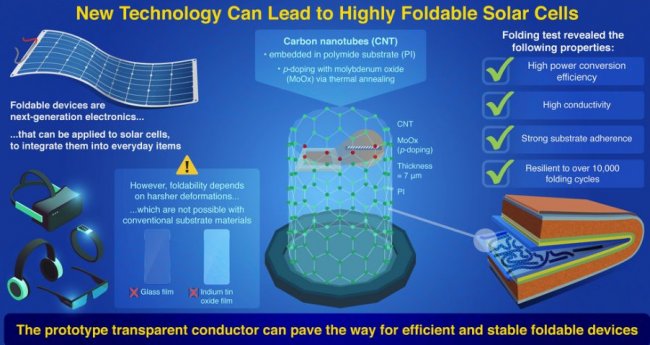 Чтобы создать действительно складную солнечную батарею, южнокорейские инженеры использовали проводящую пленку тонкую из однослойных углеродных нанотрубок. Ее объединили с полиимидной основой, а затем легировали оксидом молибдена, чтобы повысить проводимость.