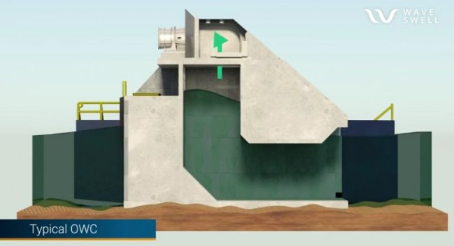 Основная часть UniWave200 — это бетонная камера, в которую забегают волны. Заполняя камеру, вода вытесняет находящийся в ней воздух, для выхода которого сделан канал в верхней части установки. Таким образом, электрогенератор представляет собой искусственное дыхало — так в геологии называют небольшое отверстие на поверхности земли, ведущие в подземные пустоты, которые могут заполняться в том числе водой из моря.