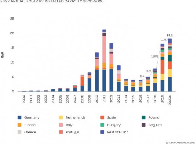 SolarPower Europe опубликовала свой новый отчет, посвященный солнечной энергетике в Евросоюзе. Он показывает, что несмотря на трудности, вызванные COVID-19, европейский рынок солнечной энергии вырос на 11% благодаря добавлению фотоэлектрических установок общей мощностью 18,7 ГВт. Это самый высокий показатель прироста с 2011 года, который делает 2020 год вторым лучшим годом для солнечной энергетики Евросоюза.
