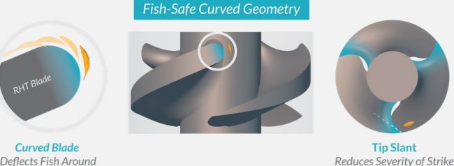 Новая гидротурбина Restoration Hydro Turbine (RHT) от калифорнийской компании Natel Energy, лишена этих недостатков. Она оснащена безопасными для рыбы лопастями с тупой и наклонной передней кромкой, а ее внутренний диаметр в зависимости от модели, составляет всего 1–3 метра.