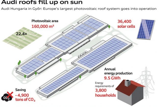 Audi Hungaria Zrt., венгерское производственное подразделение Audi AG, 7 октября 2020 года открыла в Дьёре новый логистический центр. На его территории обустроена самая большая в Европе крышная солнечная электростанция.