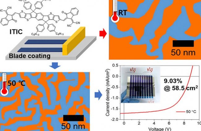 Корейские исследователи получили высокоэффективный солнечный элемент путем нанесения на поверхность специального органического раствора. При этом большое значение для достижения успешного результата, как оказалось, имеет скорость затвердевания исходного вещества.