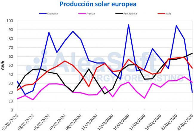 В последнюю неделю февраля производство солнечной энергии в Европе увеличилось в сравнении с серединой месяца. Лидерами роста стала Франция (прирост выработки 31%), Испания (32%) и Португалия (42%). В годовом разрезе за период с 1 по 23 февраля производство солнечной энергии выросло на 28% на Пиренейском полуострове (суммарно Испания и Португалия) и на 6% в Италии, тогда как во Франции и Германии оно снизилось на 3.1% и 15%, соответственно.