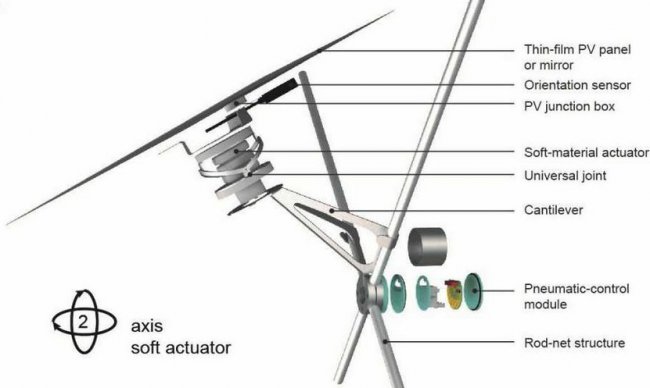 Профессор архитектуры Арно Шлютер и его рабочая группа разработали адаптирующийся солнечный фасад, который производит на 115% больше энергии, чем потребляет. Он состоит из системы подвижных солнечных панелей, смонтированных на стальных тросах. Они контролируются индивидуально и меняют положение в вертикальной и горизонтальной плоскости в автоматическом режиме. Роботизированные преобразователи управляют комбинацией мягких материалов и жестких U-образных сочленений, которые удерживают панели в нужном положении даже в неблагоприятных погодных условиях.