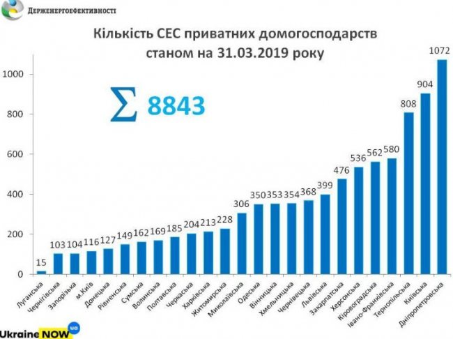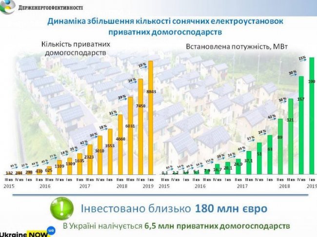 Всего в Украине, по состоянию на 01.04.2019, насчитывается почти 8850 семей, использующих солнечные панели общей мощностью 190 МВт. Для сравнения: на конец 3-го квартала 2015 таких семей было около 130.