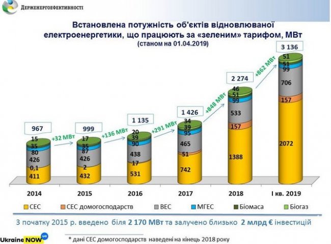 За три прошедших 3 месяца текущего года в Украине введено 862 МВт новых генерирующих мощностей электроэнергии из возобновляемых источников. Это больше, чем за весь 2018 год с показателем 848 МВт.