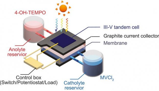 Проблему хранения собранной энергии солнечного света пытались решить разными способами, в том числе посредством гигантских аккумуляторов. В научном эксперименте, описанном учеными из Университета Висконсина, конструктивные изменения были внесены в сами фотоэлектрические панели. Интегрированный проточный аккумулятор позволяет использовать солнечную панель в трех ипостасях: собирать и немедленно конвертировать в электроэнергию солнечный свет, как это происходит в обычных фотоэлектрических элементах; накапливать и хранить солнечную энергию, а также заряжаться от других источников электроэнергии подобно традиционным батареям.
