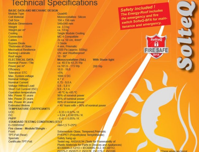 Заявленные технические характеристики кровельных модулей SolteQ Quad40 (премиальный сегмент): масса – 14 кг на 1 м2; материал фотоэлементов – монокристаллический кремний; размер модуля – 540х540 мм; производительность – от 173 до 208 Вт на 1 м2; эффективность фотоэлементов – 18,8 –19,8%; номинальное напряжение – 4,7 В; номинальный ток – 8,75 – 9,0 A; срок службы – более 40 лет; гарантия – 5 лет.