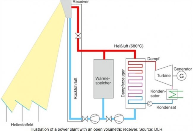 Устройство использует открытый воздушный ресивер на испытательной солнечной башне в Юлихе (Германия), способный нагревать воздух до 1100 C, который берется прямо из атмосферы и прогонятся через небольшие каналы в монолитном материале. Таким образом в системе теплоносителем является обычный воздух, в отличии от тепловых гелиоконцентраторов, использующих в качестве теплоносителя воду, расплавленные соли или твердые частицы.