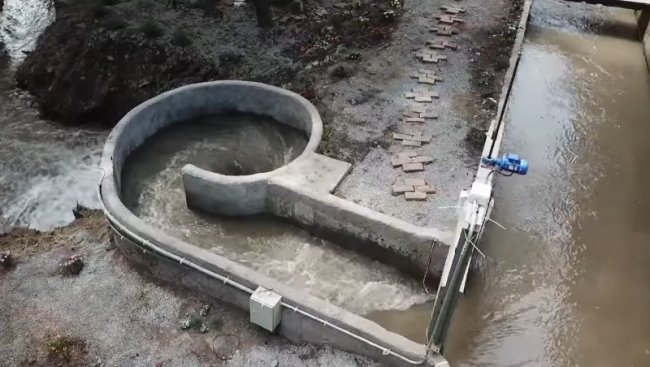 Подобную мини-ГЭС можно смонтировать за неделю. Для этого вблизи русла выкапывают рукав, по которому вода попадает в цилиндрический колодец с установленной в нем турбиной. Вся часть искусственного русла забетонирована. Падающая вода в цилиндре создает вихревой поток, вращающий лопасти. Перепад высоты для нормальной работы турбины должен быть около 1,5 м. Лопасти небольшой турбины безопасны для рыб и прочих водных обитателей, что демонстрируется в представленном ниже видео.
