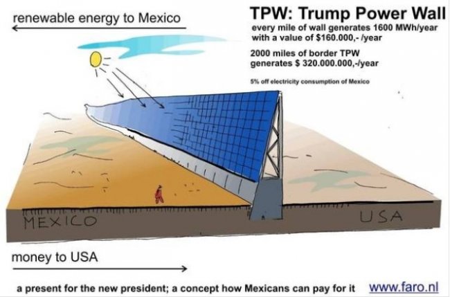 Из всех неординарных проектов, которые рассматривались для пограничной стены Трампа, собственный дизайн Трампа оказался самым неожиданным. Один из главных ярых противников борьбы с изменением климата передал республиканцам Конгресса концепцию строительства стены с солнечными батареями. По словам президента США, эти сооружения будут «красивыми структурами», которые, к тому же будут окупать сами себя.