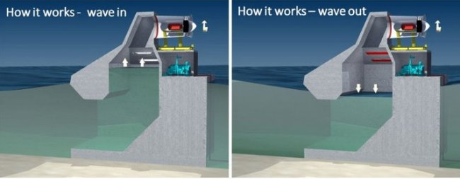 Система представляет собой осцилирующую водяную колонну. Под водой находится камера, в которую под действием волн периодически попадает вода. Работа генератора состоит из двух циклов. Поскольку камера имеет ограниченный объем, то повышение уровня воды в камере создает повышенное давление. Оно снижается за счет выхода воздуха через специальные клапаны. Когда волна начинает отступать наступает второй цикл: клапаны закрываются, уровень воды в камере опускается, за счет чего в ней образуется пониженное давление. Воздух, попадающий в камеру снаружи, начинает крутить турбину, совмещенную с электрогенератором.