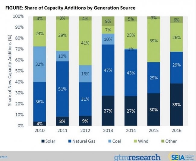 Последнее исследование рынка солнечной энергетики в США, проведённое компанией GTM Research и Ассоциацией солнечной энергетики (SEIA) показывает, что 2016 год превзошёл все ожидания роста солнечной генерации даже на фоне рекордного предыдущего года. В 2015 году прирост мощностей составил 7,5 гигаватт. В минувшем году на долю солнечной энергии пришлось 39% прироста мощностей в отраслях новой энергетики. Самым удачным для энергетиков стал четвёртый квартал, в котором они запустили агрегаты мощностью 4,8 гигаватт.