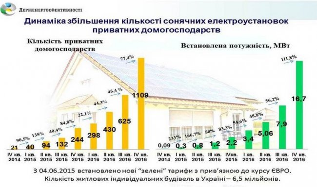 За минувший год украинцы поставили новый рекорд по скорости перехода на возобновляемые источники энергии. Так, за прошедшие 12 месяцев 2016 года число домохозяйств, которые установили частные солнечные электростанции, выросло практически в 4 раза по сравнению с 2015 годом, а в абсолютных цифрах этот показатель увеличился с 244 до 1109 домашних СЭС.