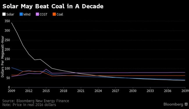 Сегодня солнечная энергия уже дешевле угля в некоторых регионах. В течении ближайших десяти лет она, скорее всего, станет самым дешевым источником энергии во всем мире, пишет Bloomberg.