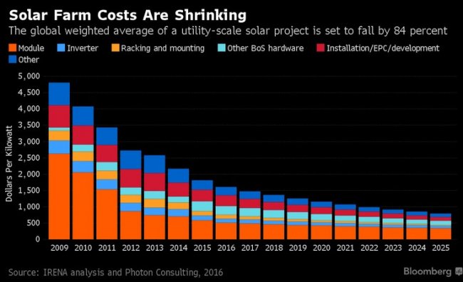 Начиная с 2009 года, «солнечные» цены упали 62%, при этом затраты значительно сокращаются в каждом звене цепочки поставок. Это связано с удешевлением банковских кредитов, вызванным сокращением рисков, а также с увеличением производства до рекордных показателей. По данным Bloomberg New Energy Finance, к 2025 году солнечная энергия может стать дешевле, чем энергия угля в среднем во всем мире.