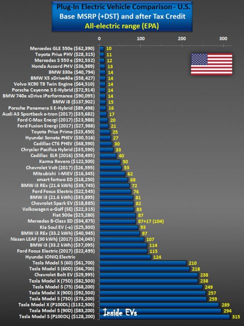 Запас хода по стандарту EPA и цены электромобилей в Штатах.