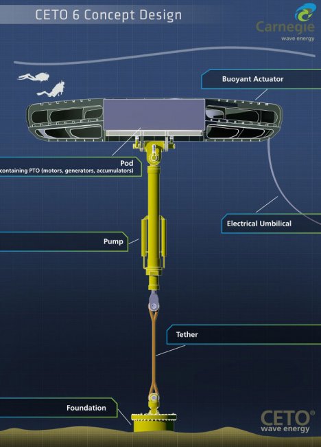 Микросеть оборудуют в Корнуолле на подключенной к энергосети тестовой площадке Wave Hub. Австралийская компания установит под воду блок CETO 6, который преобразуют энергию волн в электричество. Название CETO вдохновлено древнегреческой богиней морской пучины и чудовищ Кето. Погруженные под воду бакены двигаются вместе с волнами и передают энергию по кабелю в помпу. Она направляет жидкость под давлением на гидроэлектростанцию на суше.