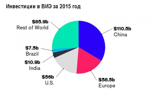В 2015 году инвестиции в ВИЭ достигли рекордного показателя за всю историю и составили 329 млрд. долларов. Причем это произошло на фоне не очень благоприятного для роста «зеленой» энергетики события – стремительного падения цен на углеводороды, главным из которых является нефть. Впервые с 2011 года, прирост капиталовложений в возобновляемое направление составил 4 процента по сравнению с предыдущим годом.