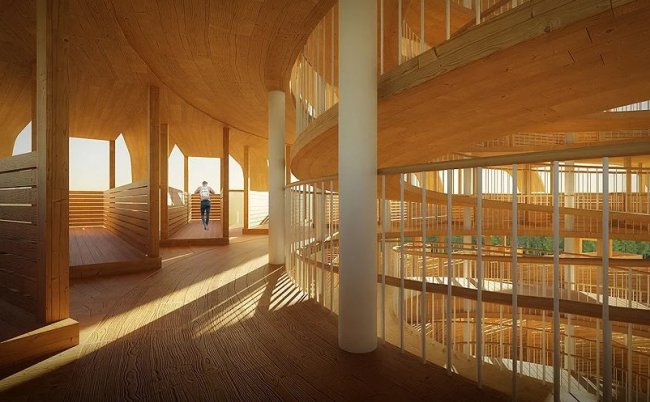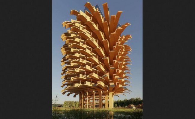 Башня высотой 35 метров — это энергоэффективное здание округлой формы из металла и дерева. Весь ее фасад состоит из множества выступающих балконов, с которых можно любоваться окружающими пейзажами. Аналогичные решения NUDES уже показало раньше в дизайн-проекте здания для лесной школы. Предполагается, что конструкция смотровой башни позволит собирать ее из отдельных готовых элементов непосредственно на месте размещения.