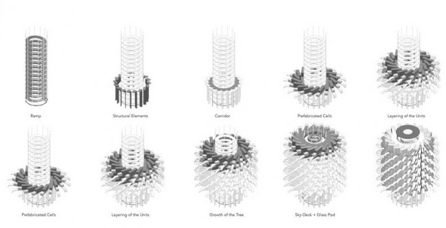 Основа «солнечного дерева» — находящаяся в центре вертикальная структура в виде спирального пандуса. Снаружи к ней примыкают площадки-коридоры, образующие этажи здания. По их внешнему периметру устанавливаются модули-ячейки, располагающиеся по касательной к коридорам.