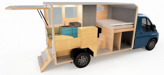 Инженеры голландской фирмы Haaks разработали кемпер, способный служить в качестве автофургона для путешественников, а также трансформироваться в двухэтажный комфортный домик для отдыха и проживания на природе. Кузов грузовика легко и быстро превращается в уютную комнату с мягкими диванчиками. В