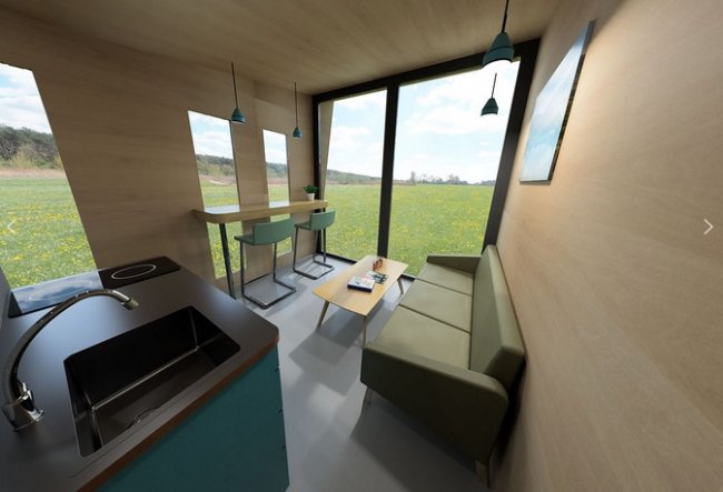 Кузов грузовика легко и быстро превращается в уютную комнату с мягкими диванчиками. В угловой части мини-дома расположена туалетная кабина с унитазом и встроенным душем. Стена напротив кушетки оборудована кухонной раковиной для мытья посуды и других предметов, а также индукционной плитой для разогрева и приготовления блюд, продукты для которых можно хранить в маленьком холодильнике, установленном в пространство между кушеткой и душевой кабиной.