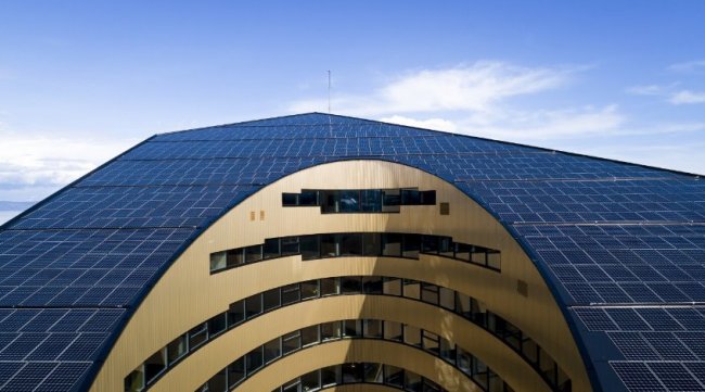 Расположение и планировка здания направлены на максимальный контакт с солнцем. Пятиугольная крыша и верхняя часть фасада покрыты солнечными батареями, которые занимают площадь около 3 000 кв.м. За год они производят примерно 500 000 кВт⋅ч электричества, что превышает потребности дома более чем в два раза.