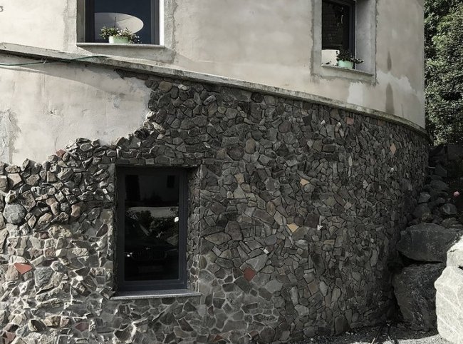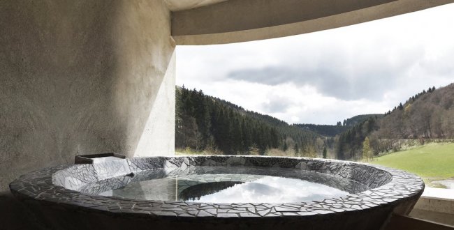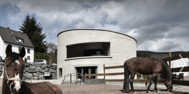 Построенный в гористом регионе Германии посреди поселка Медебах круглый дом заметно выделяется среди других построек с двускатными крышами. Чтобы необычное здание смотрелось более гармонично в местном живописном пейзаже, архитекторы использовали камни из ближайшего ручья для внешней отделки и рассчитали скат кровли под углом в соответствии с уклоном холма. Лоджия и балконы усиливают связь дома с окружающим ландшафтом.