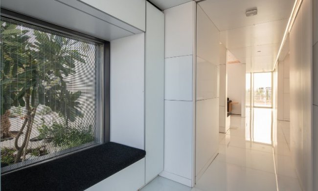 Каждый посетитель попадает в дом через прихожую, оснащенную специальным люком для дронов-доставщиков. Жилая комната оборудована раскладной мебелью и может использоваться как домашний офис днем, гостиная – вечером и дополнительная спальня по ночам.