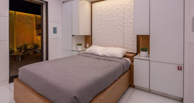 В спальне есть подъемная кровать Мёрфи, "умное" зеркало и "умный" матрас, запоминающий основные позы сна пользователя.