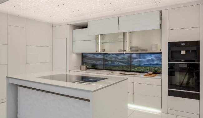 Рядом находится кухня, оборудованная подключенными к интернету гаджетами, тачскринами и столом со встроенным сенсорным TV-экраном. В кухне есть индукционная варочная поверхность, раковина с краном, холодильник и другая техника. Для удобства высоту шкафов можно регулировать под свой рост.