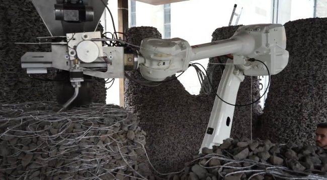 Машина сначала создает фундамент из проволоки, на которую затем насыпаются камни. Слой за слоем щебень смешивается с армирующей нитью, проходящей через него. В результате получается практически монолитная стена. Теоретически такую технологию можно отнести к 3D-печати. Создание объекта, как и в 3D-строительстве, выполняется послойно. При этом здесь нет необходимости использовать цементные смеси или задействовать высокие температуры.
