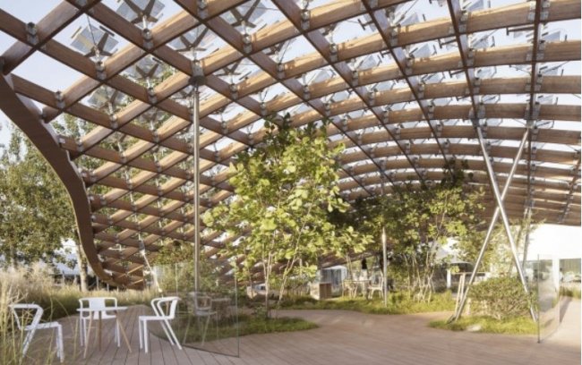 Обширная изогнутая крыша «Обитаемого сада» покрыта солнечными панелями Hanergy, причем углы наклона скатов просчитаны таким образом, чтобы обеспечить максимальную инсоляцию каждой панели в течение светового дня.