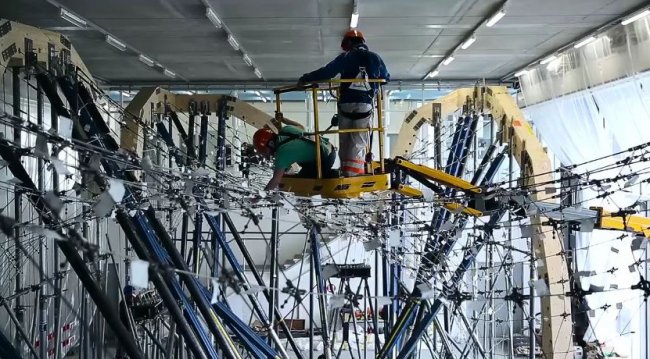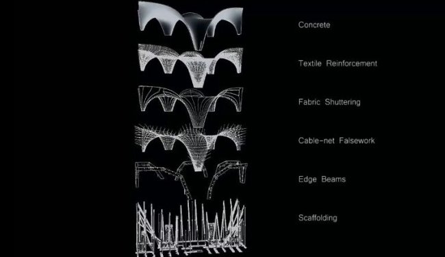 Для реализации такой сложной архитектуры, вместо традиционной опалубки, обычно использующей неперерабатываемые и изготавливаемые на заказ деревянные формы, исследователи задействовали переплетенные между собой съемные стальные тросы. Эта сетка из прочных кабелей поддерживала полимерный текстиль, что позволило им вместе выполнить функцию опалубки для жидкого бетона.