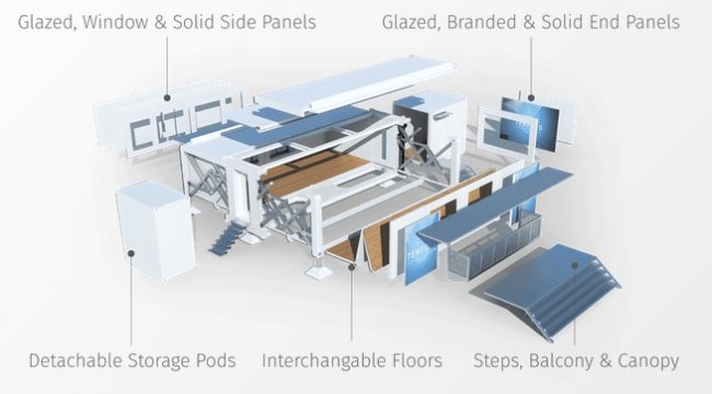 После установки здание становится в три раза больше, чем при транспортировке, при этом все встроенные источники света и коммуникации уже установлены. Базовый блок компании составляет около 60 кв. м. при развертывании.