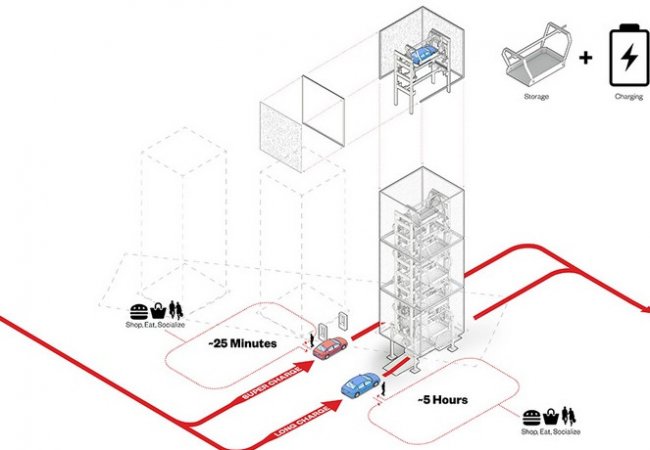 Charging Tower также может обслужить водителей, которые не располагают свободным временем. Она включает в себя опции как для стандартной, так и скоростной зарядки. Подобно «суперчарджерам» Tesla, мощные станции расположены нижнем уровне и имеют большую пропускную способность. Более медленные электрозаправки расположены на верхних уровнях здания.
