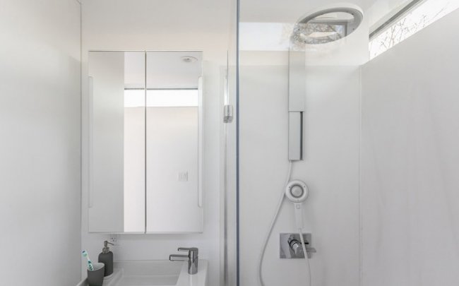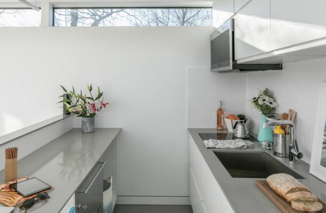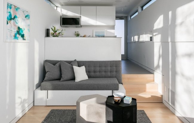 Стильный, красивый и умный домик занимает всего 33 кв. м. Внутри находится двухуровневое жилое пространство с трансформируемой мебелью, белыми стенами и потолком высотой три метра. Интерьер выглядит просторным и воздушным. Впечатляет то, что дом снабжён всеми удобствами и напичкан современным оборудованием. К примеру, прозрачностью окон управляет специальное приложение для смартфонов, анализирующее степень освещённости. Домик заранее оборудуется душем, холодильником, печью, духовкой, стиральной машиной и кроватью огромного размера.