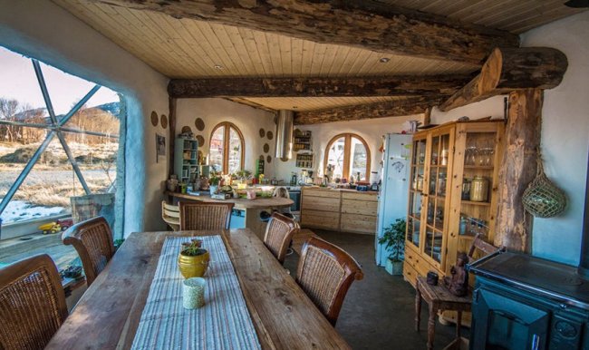 Непосредственно жилая постройка сооружена из экологически чистых материалов и, по сути, представляет собой саманный дом – его основными строительными компонентами стали глина, песок и солома. Стеклянный купол поверх экодома не только защищает его от сурового климата заполярья, но и создает внутри тепличные условия, позволяющие владельцам выращивать фрукты и овощи большую часть года. Возводить дом своей мечты норвежской семье помогали друзья и соседи.