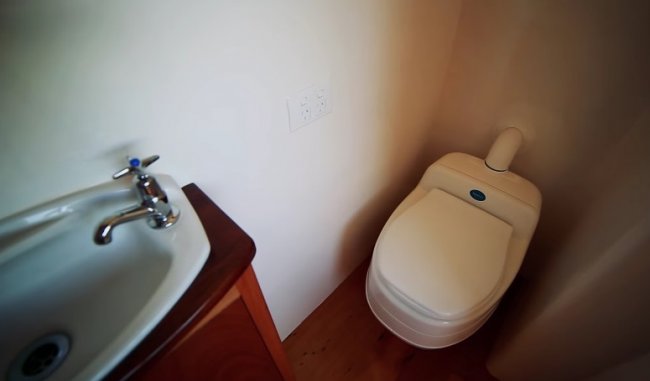 На рабочей поверхности в кухне установлен 130-литровый холодильник, раковина, варочная поверхность и духовой шкаф, а над ними вытяжка. Отведено место для душа и компостный туалета.
