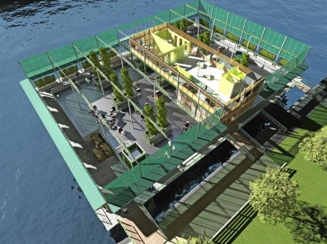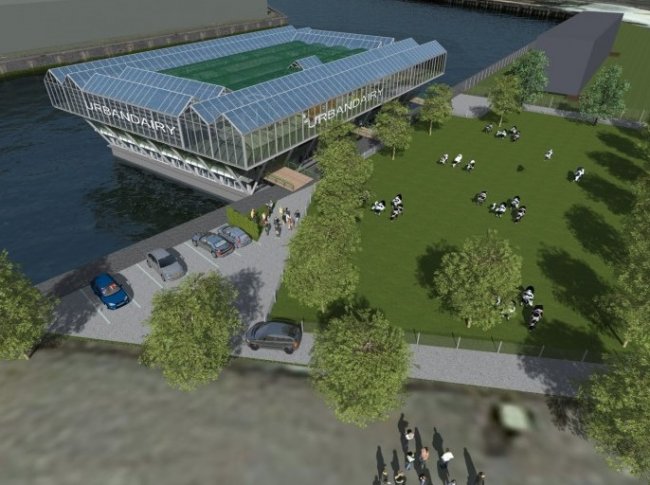 На понтоне площадью 1200 кв. м ферма должна производить молоко практически автономно, а для ее обслуживания потребуется всего двое работников. На верхнем этаже под стеклянной крышей будут размещаться 60 коров. Пол из искусственного газона и настоящие деревья должны создать для животных максимально приближенное к природному окружение.