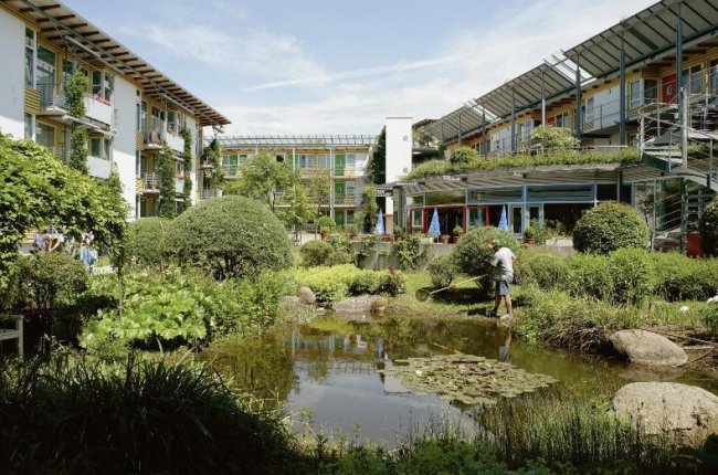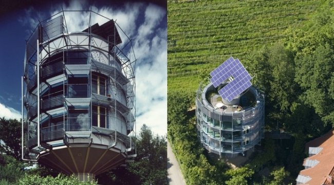 Архитектор Рольф Диш оборудовал солнечными батареями стадион футбольного клуба, затем построил "Гелиотроп". Это частный дом Диша. Он считается первым в мире зданием, которое производит больше энергии, чем потребляет. На крыше расположена солнечная батарея с 60-ю монокристаллическими кремниевыми модулями. Они поглощает солнечные лучи и преобразует их в электрический ток. С помощью компьютера владелец дома может следить, сколько энергии было произведено и потрачено. В зависимости от времени года "Гелиотроп" производит в четыре - шесть раз больше энергии, чем потребляет.